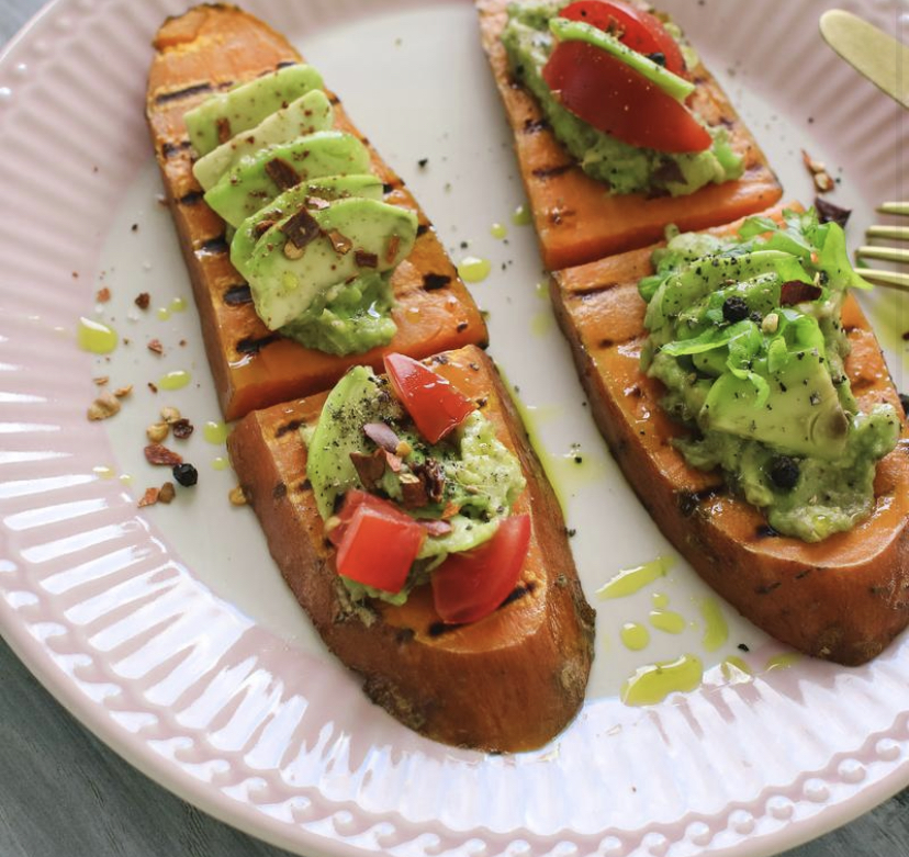Mezitím nakrájejte avokádo, pokud chcete namačkejte citronovou šťávu chilli a pepř, poté pomazánku namažete na batáty a ozdobíte cherry rajčátky a kořeníte :) easy peasy :)