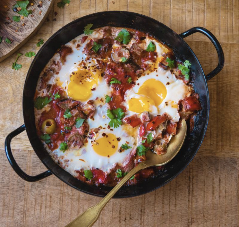 K zelenině přidejte rajčatový protlak a bylinky, takto vaříme cca 12-15 minut, předehřejte troubu na 180 stupňů. Lžící udělejte důlky na vejce, poté nalijte vejce do důlků , pánev vložte do trouby a pečte 10 minut , dokud nejsou vejce hotová. Navrch nasypejte bylinky.