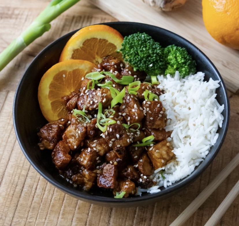 Co potřebujete : 200g tofu, 12g zázvoru, 3 stroužky česneku, 2 lžíce olivového oleje, 2 lžíce rýžového octu, 1 lžíce vody, 2 lžičky cukru z kokosového květu, 1 lžička hoison omáčky, 2 plátky pomeranče, 3 lžíce škrobu, 1 lžíce rýžové mouky, 4 lžíce oleje, 1 lžička sezamových semínek