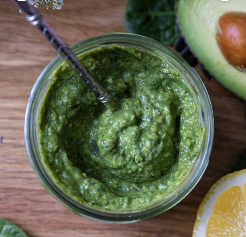Co potřebujete: 50g baby špenátu, 1 hrst čerstvým bylinek, nebo dvě hrsti sušených bylinek, 100g avokáda, 20ml citronové šťávy, 15g dýňových nebo slunečnicových semínek, česnek, půl lžičky soli, pepř