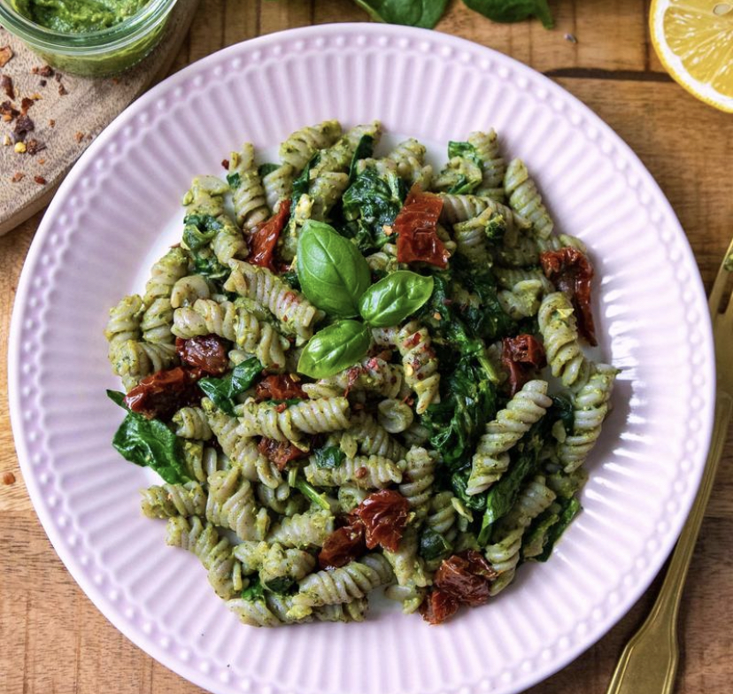 Co potřebujete : 80g celozrnných těstovin ( pohankové, nebo špaldové), 1 hrst baby špenátu, 50g sušených rajčat, 50ml ovesného mléka, nebo smetany, 50g pesta, chilli, sůl, pepř, muškátový oříšek