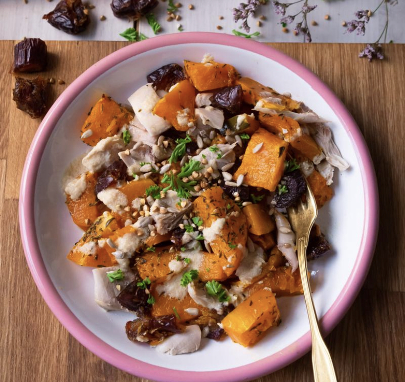 Co potřebujete : 400g dýně, 1 lžička olivového oleje, 2/3 lžičky soli, 1/2 lžičky sušených bylinek ( např. sušený tymián), 100g kuřecích prsou, 20g tahini, 10ml citronové šťávy, 10ml vody, 1 lžička medu, nebo javorový sirup, 30g datlí, lžička slunečnicových semínek