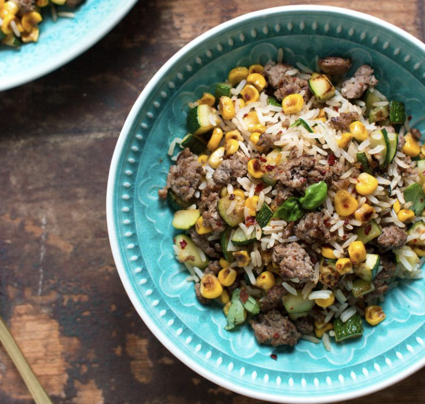 Co potřebujete: 50g dlouhozrnné rýže, sůl, 1-2 lžičky kokosového nebo avokádového oleje, pepř, chilli v prášku, 100g mletého hovězího, 100g cukety, 100g kukuřice, 1 hrst bazalky