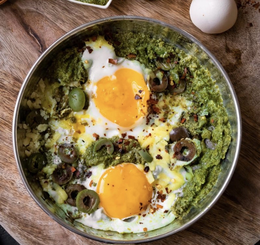 Příprava : Rozehřejte pánev a přidejte dvě porce pesta a nahrubo rozetřete a vedle osmažte olivy. Rozbijte vejce a vložte je na pesto, smažte dokud vejce nebude hotové.