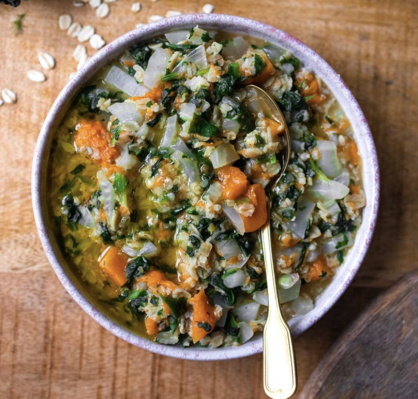 Co potřebujete : 100g dýně nebo sladkých brambor, 100g lilku nebo cukety, 1/2 lžičky soli, 250ml vody, 50g ovesných vloček, 50g špenátu ( čerstvý nebo mražený), 1 lžíce olivového oleje