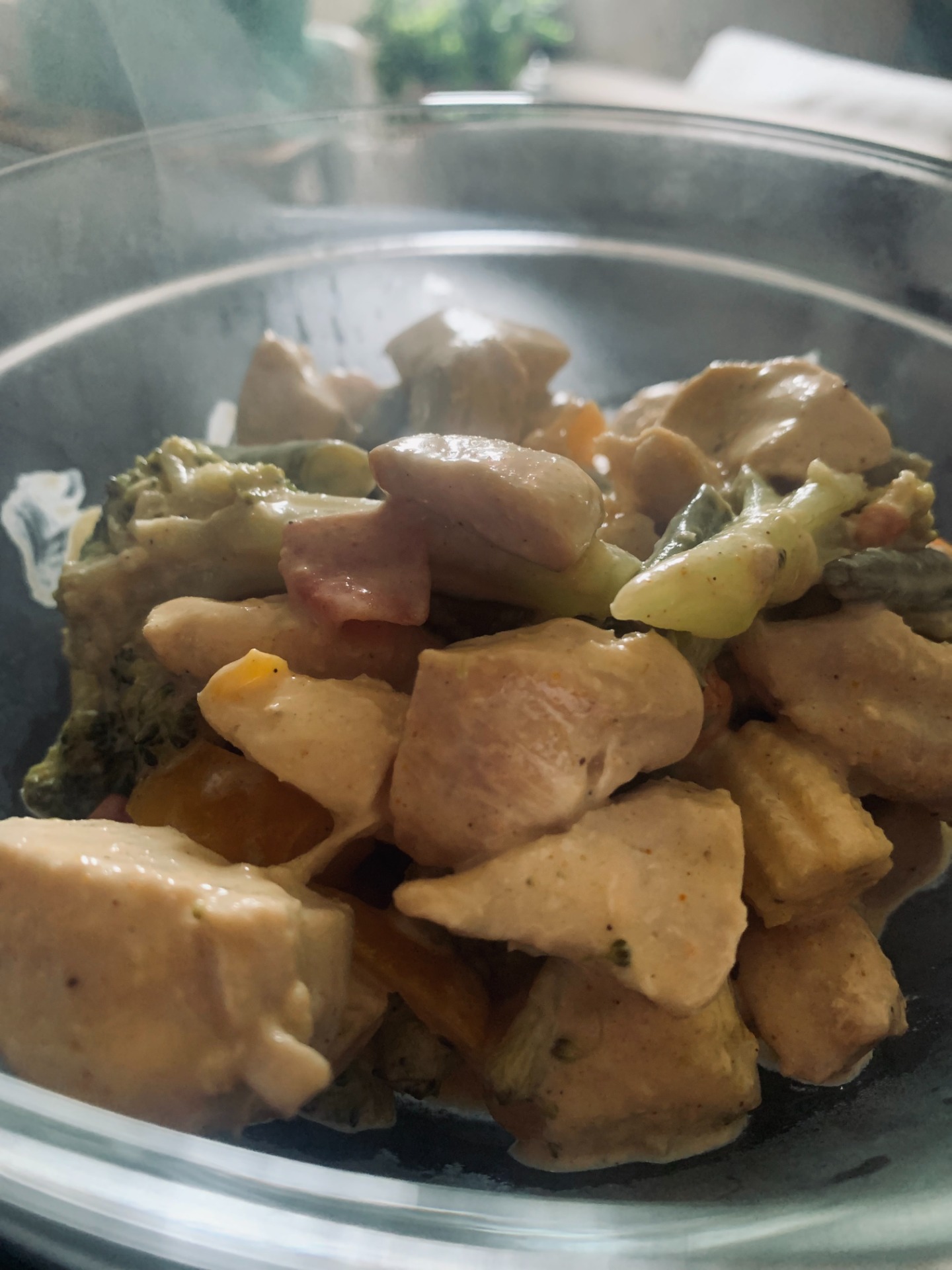 Co potřebujete : 400g kuřecích prsou, brokolice ( já volím mraženou), zelené fazolky, paprika ( žlutá, červená), rajčata, kukuřice ( já kupuji mini klasy v nálevu), kokosové mléko, nebo smetana, žluté kari, pepř, sůl, zázvor